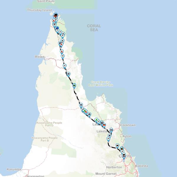 - Turn right onto Bamaga Road. for: 0.34 km time: 01:08
