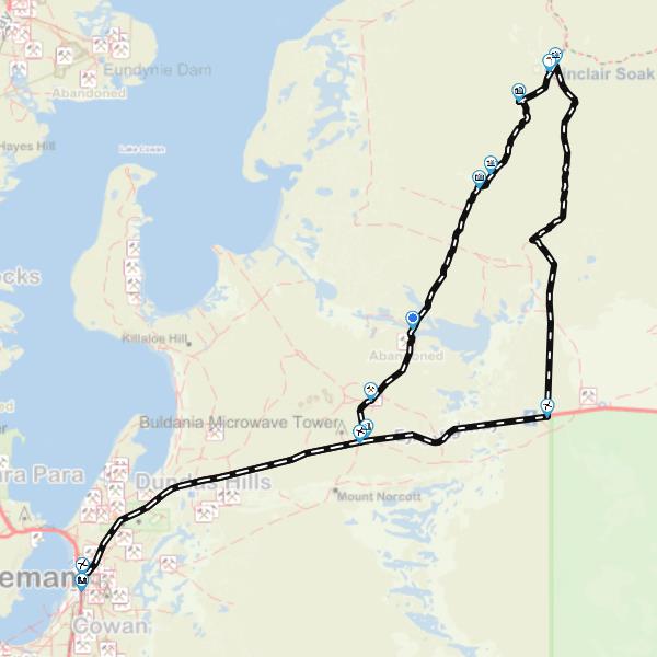 The general terrain is reasonably flat and sandy, with belts of salmon and other gum trees, tea tree and scrub. Track speeds vary between 5 km to 35 km per hour with the average being around 10 km per hour. Sinclair Soak is a nice place to stop. It is set in an area of wet ground near flat rocks. The soak is a 300 metre walk from the track.