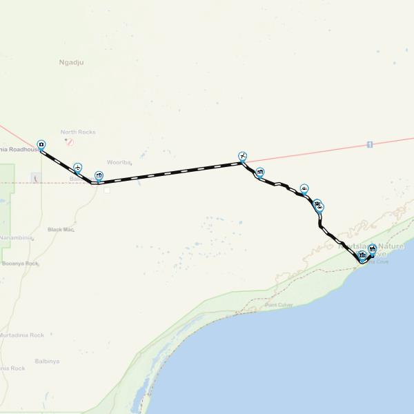 Fuel is available at the town of Norseman and at Balladonia and Caiguna Road Houses. It is a minimum of 165 kms one way from Balladonia to Toolinna Cove, plan your fuel needs carefully. Norseman is the main supply town in the area, for food, fuels, vehicle repairs and servicing. It is 188 kms west of Balladonia Road House along the bitumised Eyre Highway. Balladonia Road House sells fuel and some limited supplies. Caiguna Road house, 181 kms to the east of Balladonia Road House also sell fuel and limited supplies. Drinking water is not available at Balladonia or Caiguna Road Houses; collect your supplies in Norseman. Note Balladonia Road House is 27 kms west north west of Balladonia Homestead, there is a danger of the two being confused by travellers.